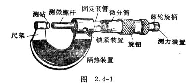 外徑千分尺常簡(jiǎn)稱(chēng)為千分尺,它是比游標(biāo)卡尺更精密的長(zhǎng)度測(cè)量?jī)x器,常見(jiàn)的一種如圖2.4-1所示,它的量程是0-25毫米,分度值是0.01毫米。外徑千分尺的結(jié)構(gòu)由固定的尺架、測(cè)砧、測(cè)微螺桿、固定套管、微分筒、測(cè)力裝置、鎖緊裝置等組成。固定套管上有一條水平線,這條線上、下各有一列間距為1毫米的刻度線,上面的刻度線恰好在下面二相鄰刻度線中間。微分筒上的刻度線是將圓周分為50等分的水平線,它是旋轉(zhuǎn)運(yùn)動(dòng)的。