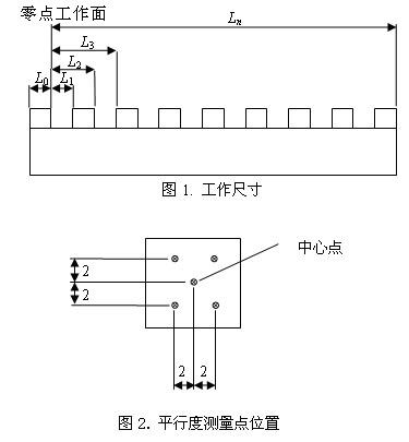 步距規(guī)上各工作平面對零點工作面的平行度。如圖2所示,在平面上偏離中心點2mm的4個點對步距規(guī)進行測量,示值相對于零點工作面的距離變化量的最大值是該工作面的平行度。