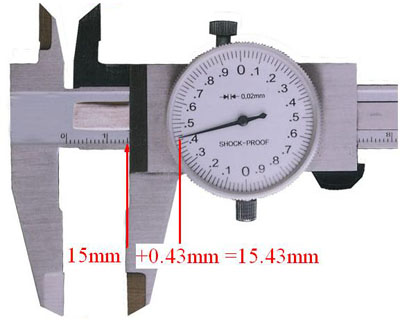 For example, a measurement of 15.43 millimetres would be obtained by reading 15mm on the main scale, and then adding 0.43mm as determined by the dial(as shown in the image).