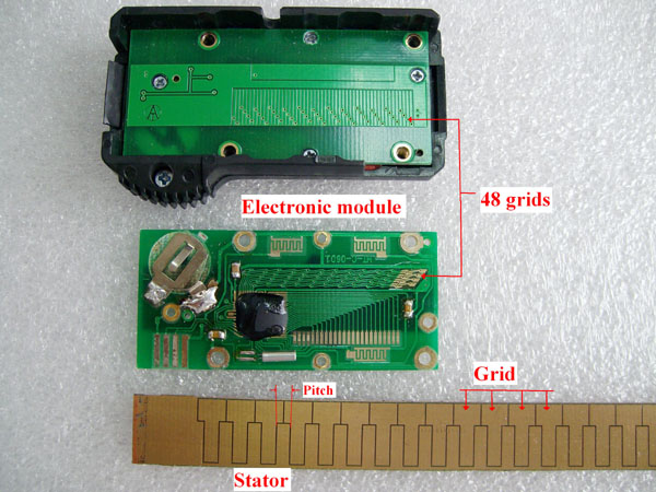Digital calipers contain Grid-Capacitance Linear Synchronous Sensors which are comprised of a set of grid-capacitances and signal processing circuit.The set of grid-capacitances consist of stator grid-capacitance and sliding grid-capacitance. A pattern of grids is etched directly on the top copper layer of a standard glass-epoxy laminate of the printed circuit board stator. In the slider another printed circuit board contains 48 etched separate grids which are called emitters. The combination of these printed circuit boards forms two variable Capacitors. As the slider moves the capacitance changes in a linear fashion and in a repeating pattern. The two capacitances are out of phase. The signal processing circuit built into the slider counts the grids as the slider moves and does a linear interpolation based on the magnitudes of the capacitors to find the precise position of the slider.